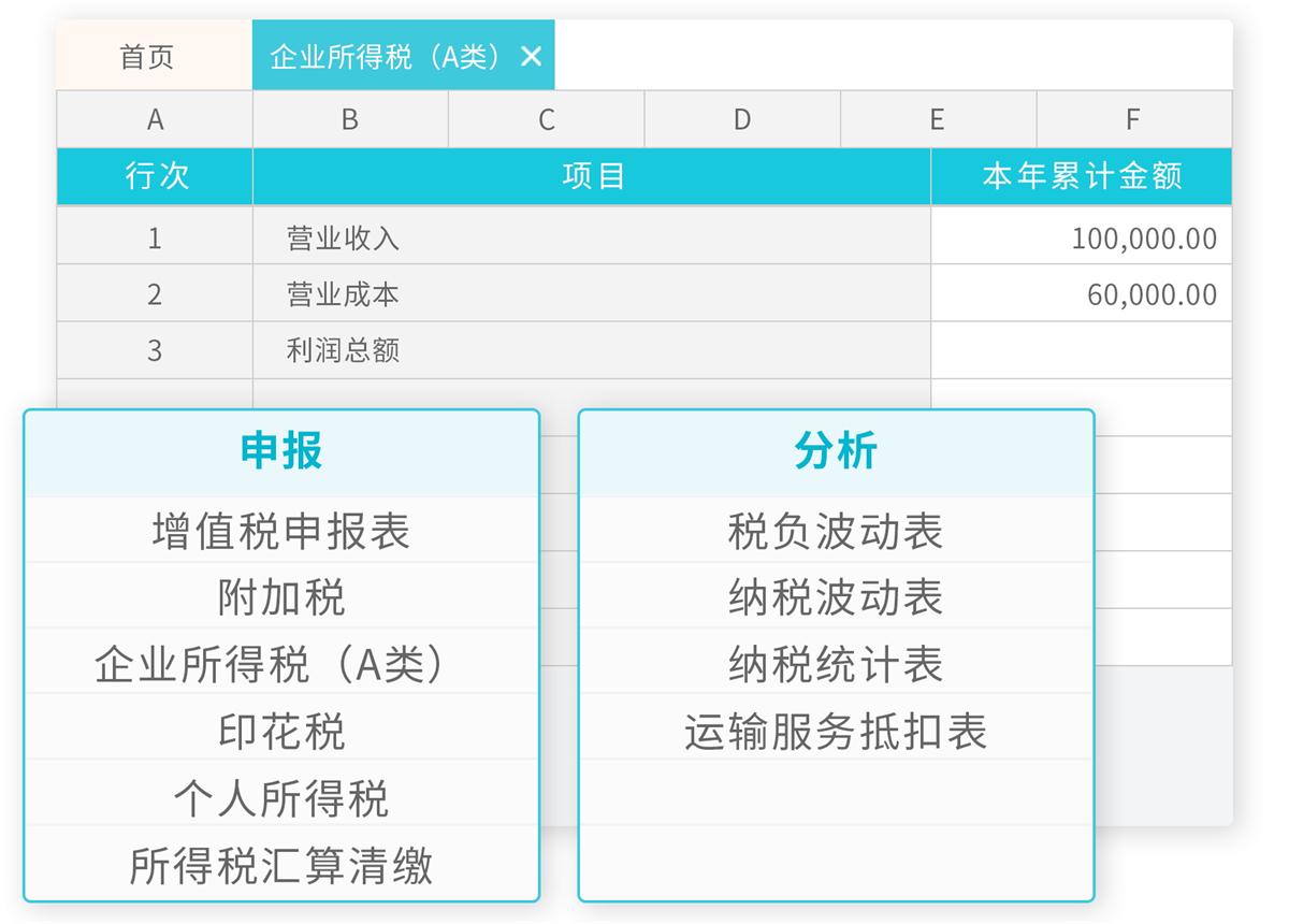 從此擺脫報一次稅要切換多少個系統;通過稅表自動生成、國稅/個稅一鍵申報、稅負測算、稅務風險預警實現財稅互聯,輕松準確報稅;同時多項監控指標,輕松檢查財稅風險